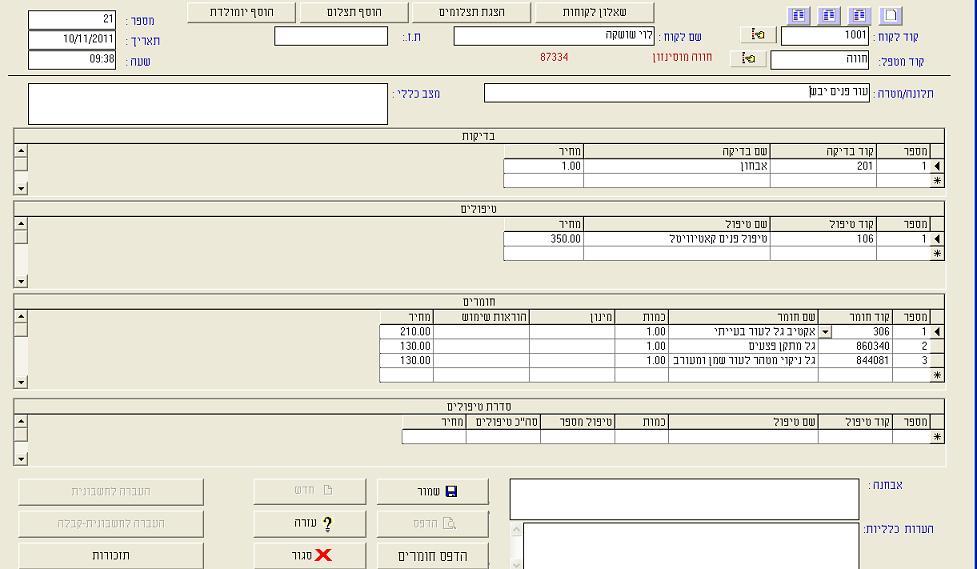 מכיל מידע על הביקור-טיפול כגון: